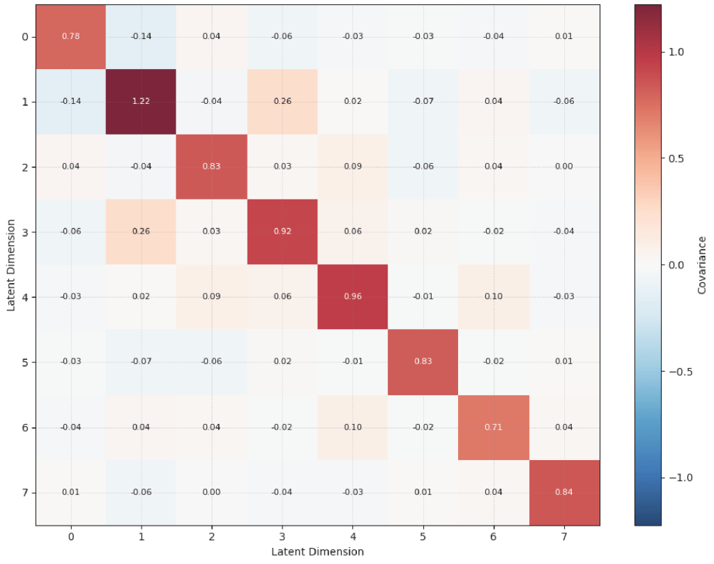 To further refine the representation I added a decorrelation loss to the training objective. Standard VAEs often suffer from redundancy where multiple latent dimensions encode the same information or some dimensions are ignored entirely. By penalizing the covariance between latent dimensions I forced the model to spread the information across the entire latent space. Without this I would often see certain directions in the latent space collapse and become unused, with the model getting stuck in a local optimum of focusing on easy features and failing to learn as meaningful of a latent space. This creates a disentangled space where every dimension is statistically independent and easier to use.