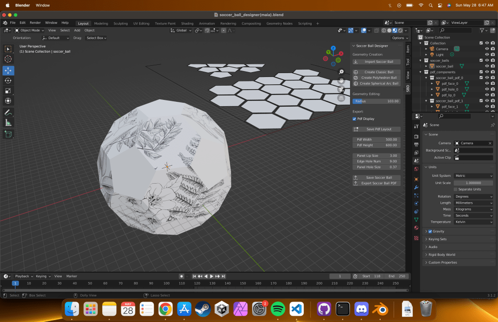 Developed a Blender plugin that streamlines both the digital and physical creation of custom soccer balls. The tool automates panel generation based on user-defined geometry, applies 2D artwork seamlessly onto the curved surface with minimal distortion, and exports each panel in a laser-cuttable format.